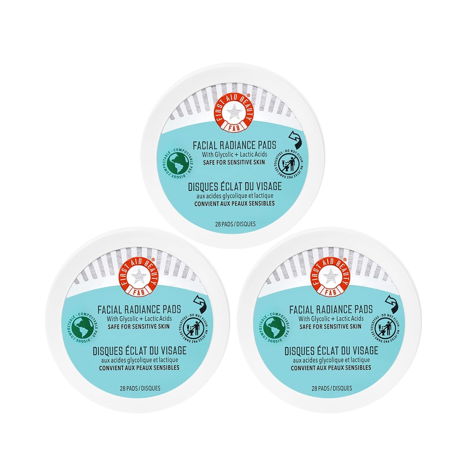 First Aid Beauty - Facial Radiance Pads with Glycolic & Lactic acids, Daily Exfoliating pads with AHA to Help Tone & Brighten Skin, One Step Makeup Prep, Compostable for Daily Use, 28 Pads, 3 ct