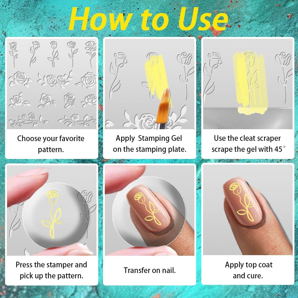 - Easy to Use: 1. Apply paint adhesive to the stencil, then use the scraper to quickly scrape off the excess 2.Use silicone stamper to press down on the transfer pattern 3. Quickly transfer the pattern onto your nails 4.Bake dry to apply sealer then shine the lamp