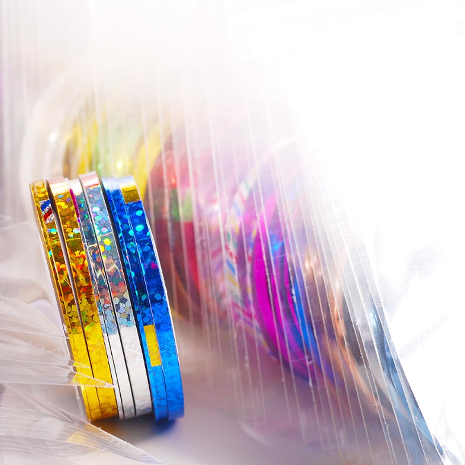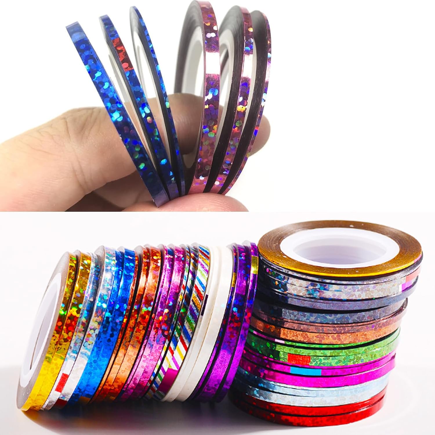 - 【Effect 】These nail tapes are laser strips,suit design nail art at home or nail salon.Texture nail tape strips for design.This striping tape for tumblers is made of environmentally friendly plastic and paper materials,french line nail stickers's color on the very bright,in the light nail art stickers tapes can have a dazzling nail chrome powder color and laser effect.