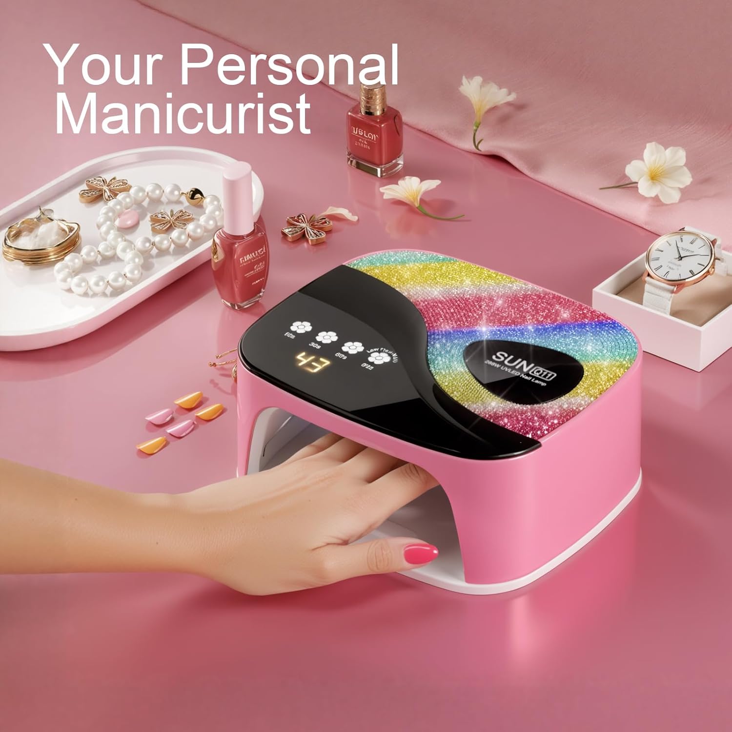 SUNX11 Rhinestone uv Nail Lamp - LED UV Gel Nail Dryer with Rainbow Crystal Design, 3-Second Quick Dry, Touch Screen, Detachable Base, 4 Timer Settings, for Fingernails & Toenails