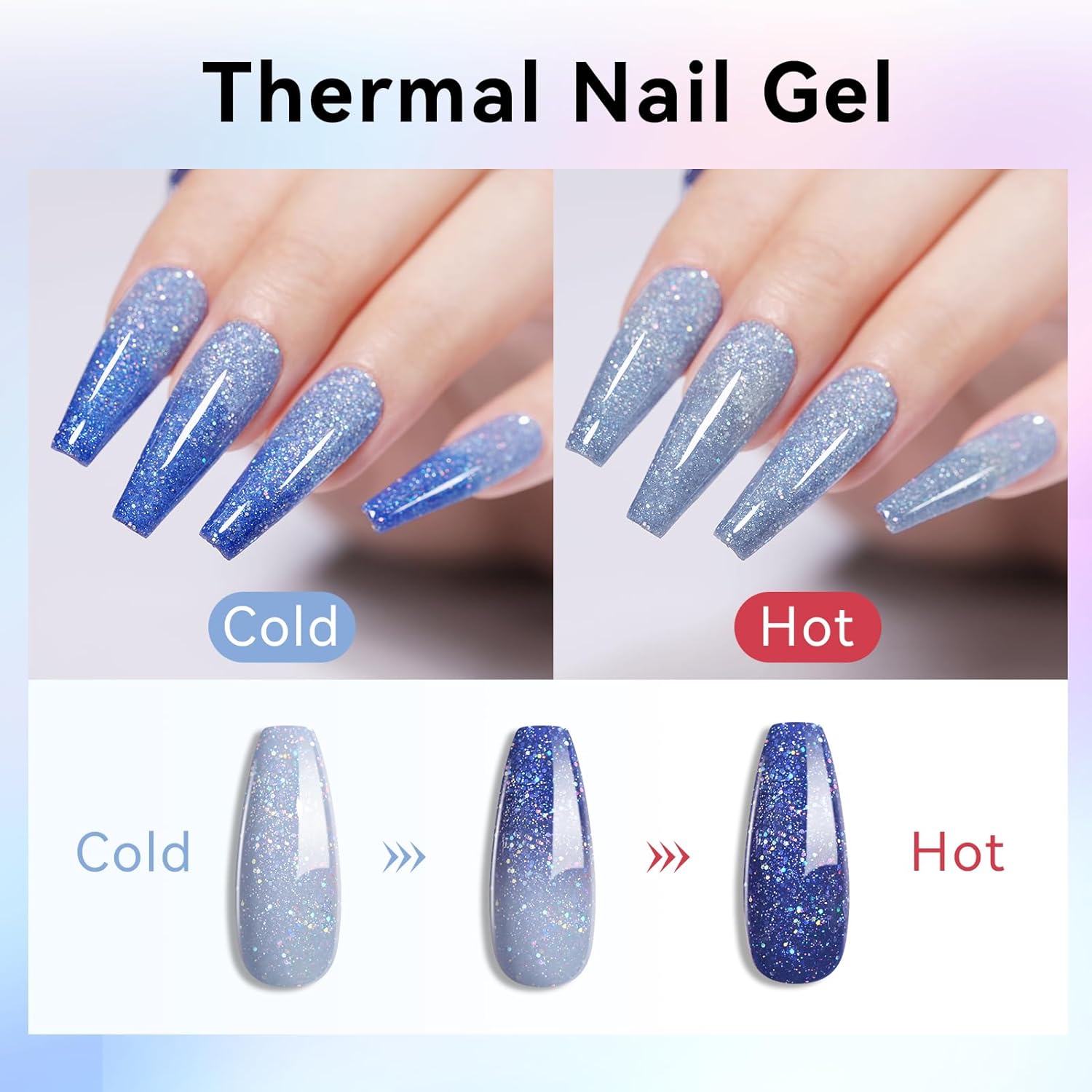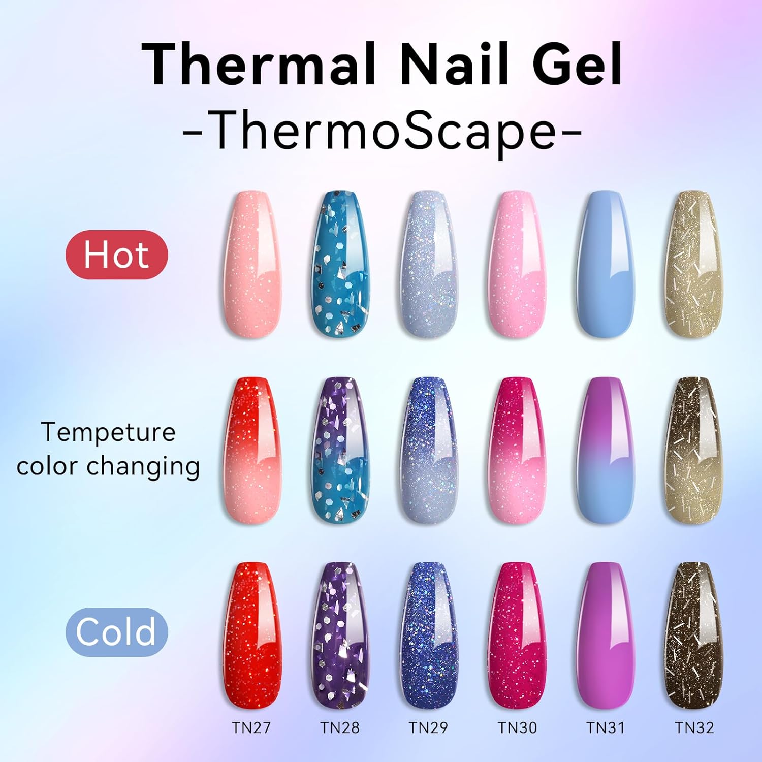 - [Color Changing Gel Nail Polish]: The color of this gel nail polish set will change with the temperature, you can enjoy two beautiful at the same time; The color change is not only affected by body temperature, but also by environmental temperature; Applying on long nails will make the effect more obvious