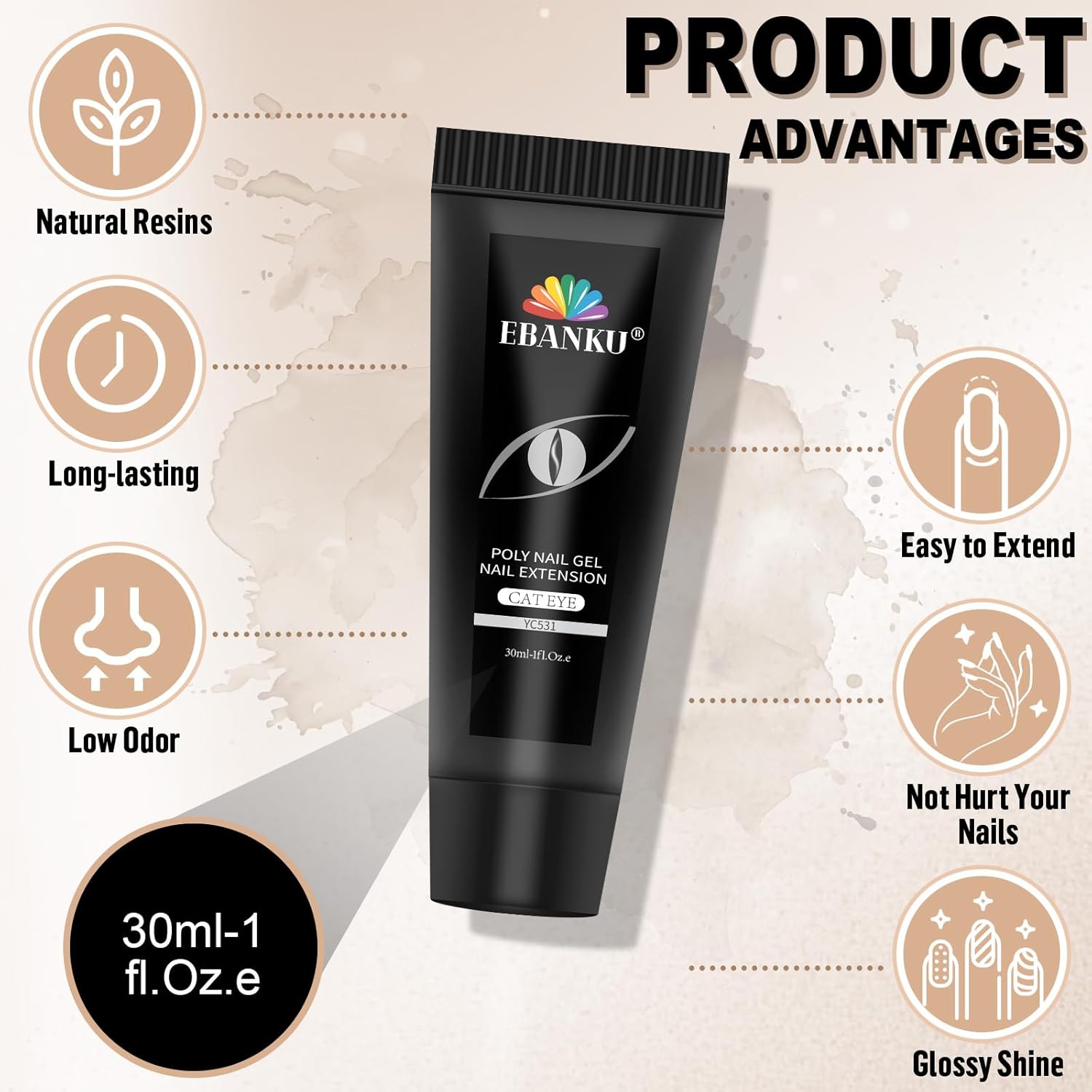 - 【Glitter and Cat Eye Effect】EBANKU glitter and cat eye nail extension gel kit have glitter and cat eye poly nail gel are optional for you to DIY more fashion nails at any occasions, anniversary, wedding, dating, party etc. NOTE: When using the magnet, different light and angles will create a variety of amazing cat eye effects.