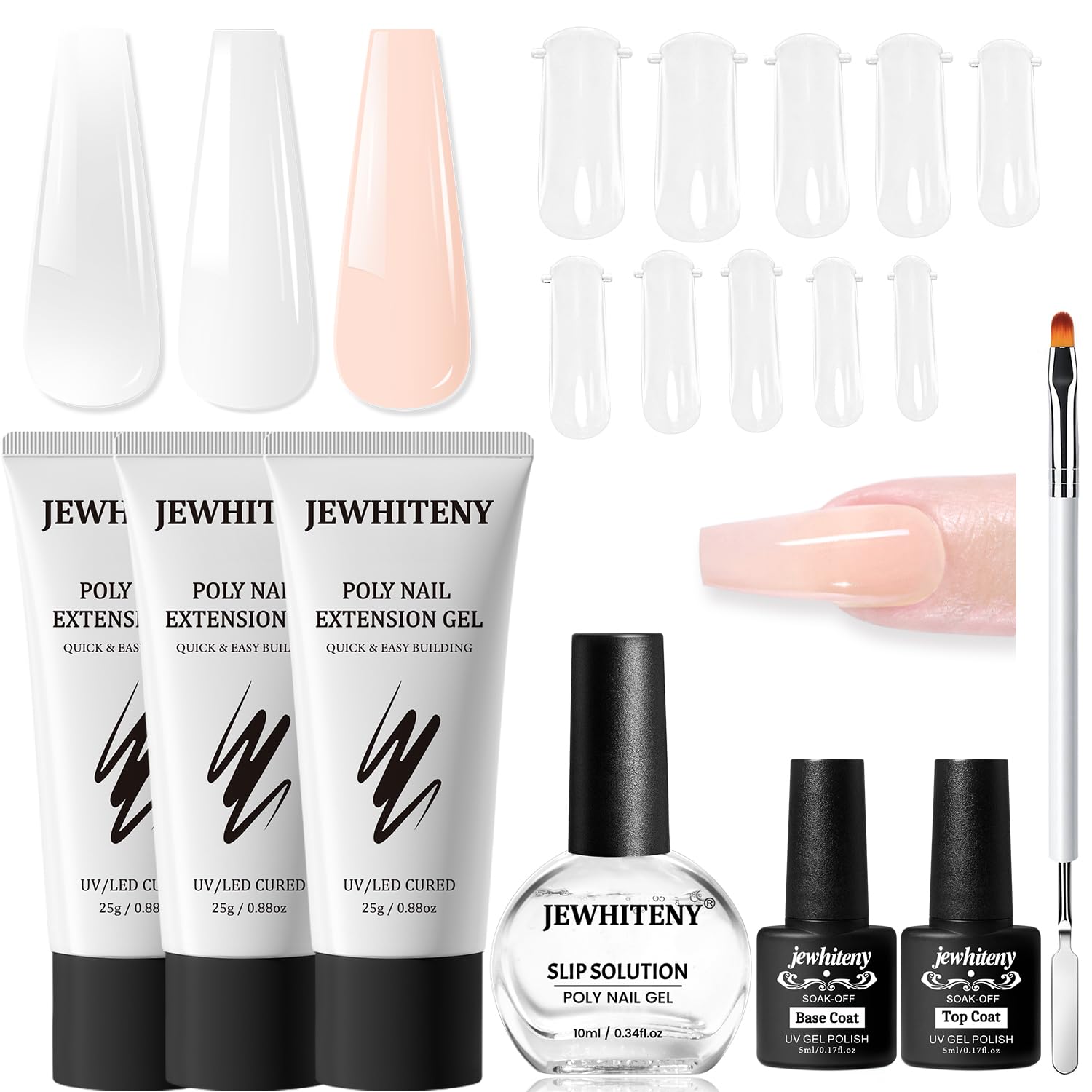 JEWHITENY Poly Extension Gel Nail Set Clear White Pink Poly Nail Gel With Slip Solution Base Coat Top Coat French Manicure for Finger Art and Home DIY Need U V Lamp Curing