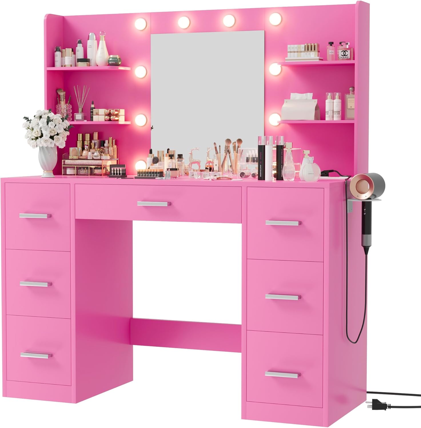 Furmax Vanity Desk with Mirror, LED Lights and Power Outlet Makeup Vanity Table with 7 Drawers and 6 Storage Shelves Dressing Table for Bedroom Dressing Room (Pink)