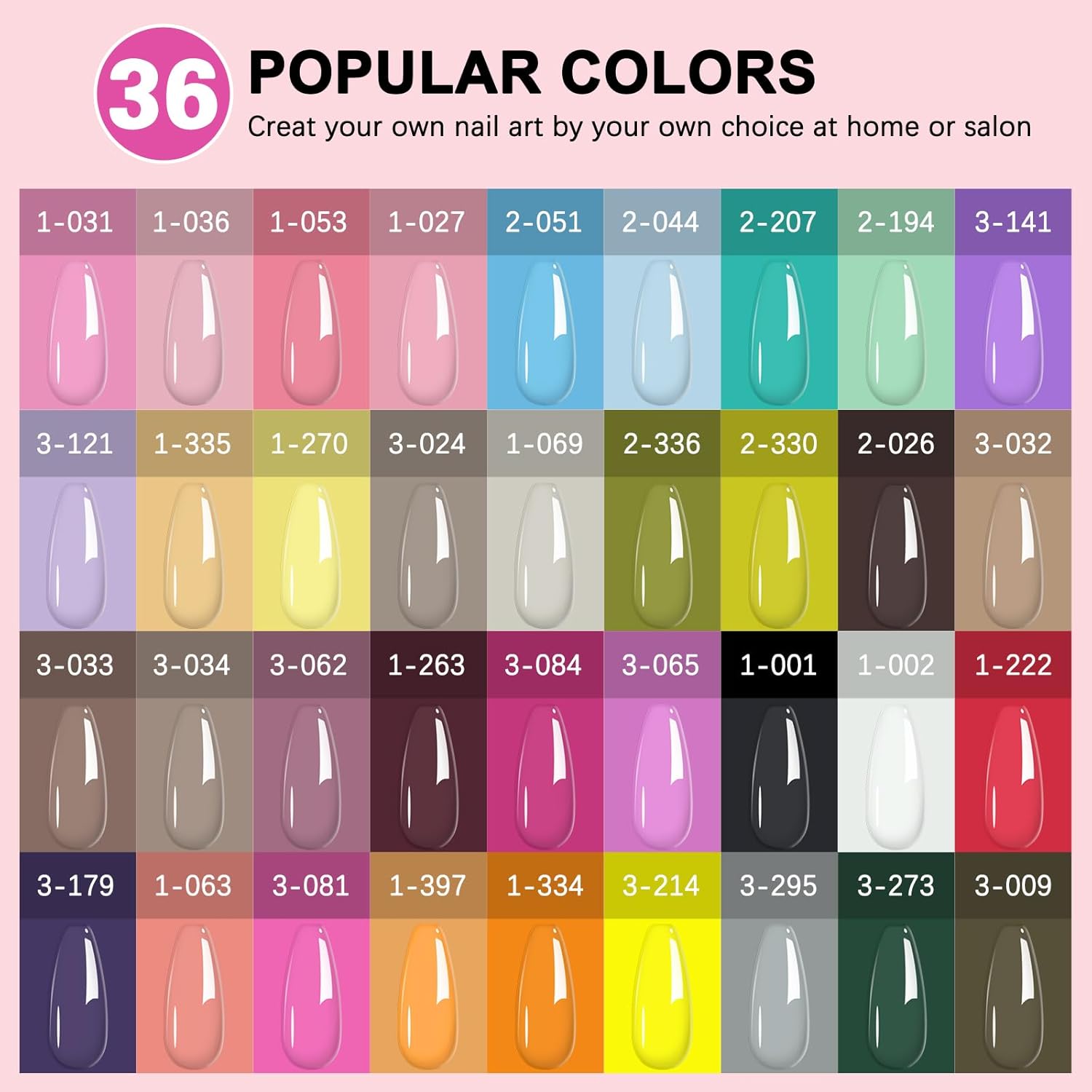 - 【Easy Application & Long lasting】Our Gel Nail Polish with UV Lamp Set includes all the tools you need for a complete manicure, allowing you to easily create your own nail art. With 36 carefully selected colors, you can mix and match according to your mood and ideas, including black, white, green, yellow, pink and more. Following the instructions in our manual, you can enjoy up to 28 days of flawless, chip-resistant nails.