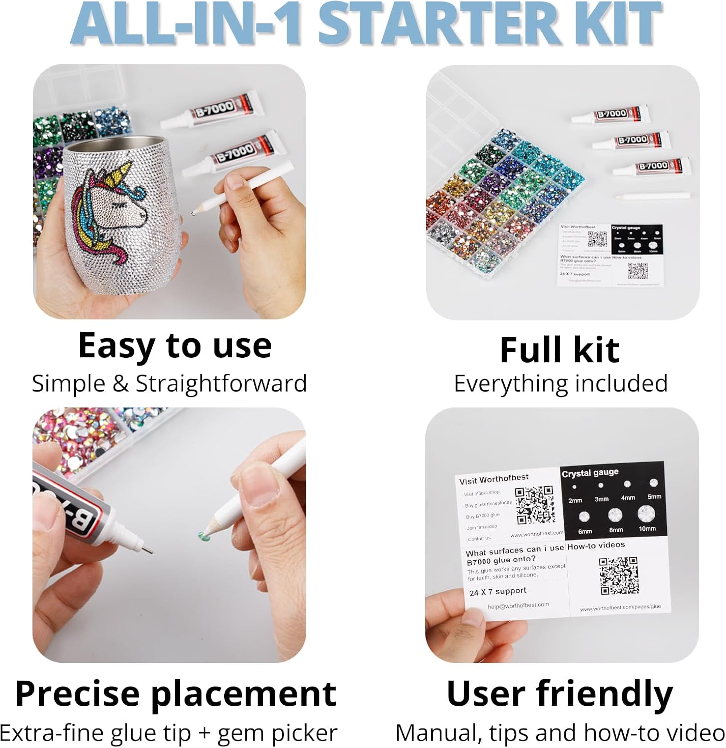 - Easy to Use -- This kit is designed to be straightforward, and versatile for various crafting projects. The manual is user-friendly and beneficial for both novice and experienced crafters. The complete and durable tools are suitable for precisely applying rhinestones to create intricate designs, with no additional tools required. Rhinestones are easy to apply and remove. The sturdy container with 24 grids keeps all rhinestones organized by size and color, making them easy to store and access