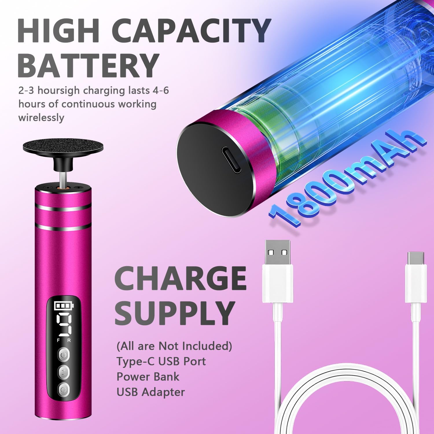 - ✅ Quiet & Long-Lasting – Low-noise motor won’t disturb others. 1800mAh rechargeable battery (4-5 hrs runtime) with Type-C fast charging.