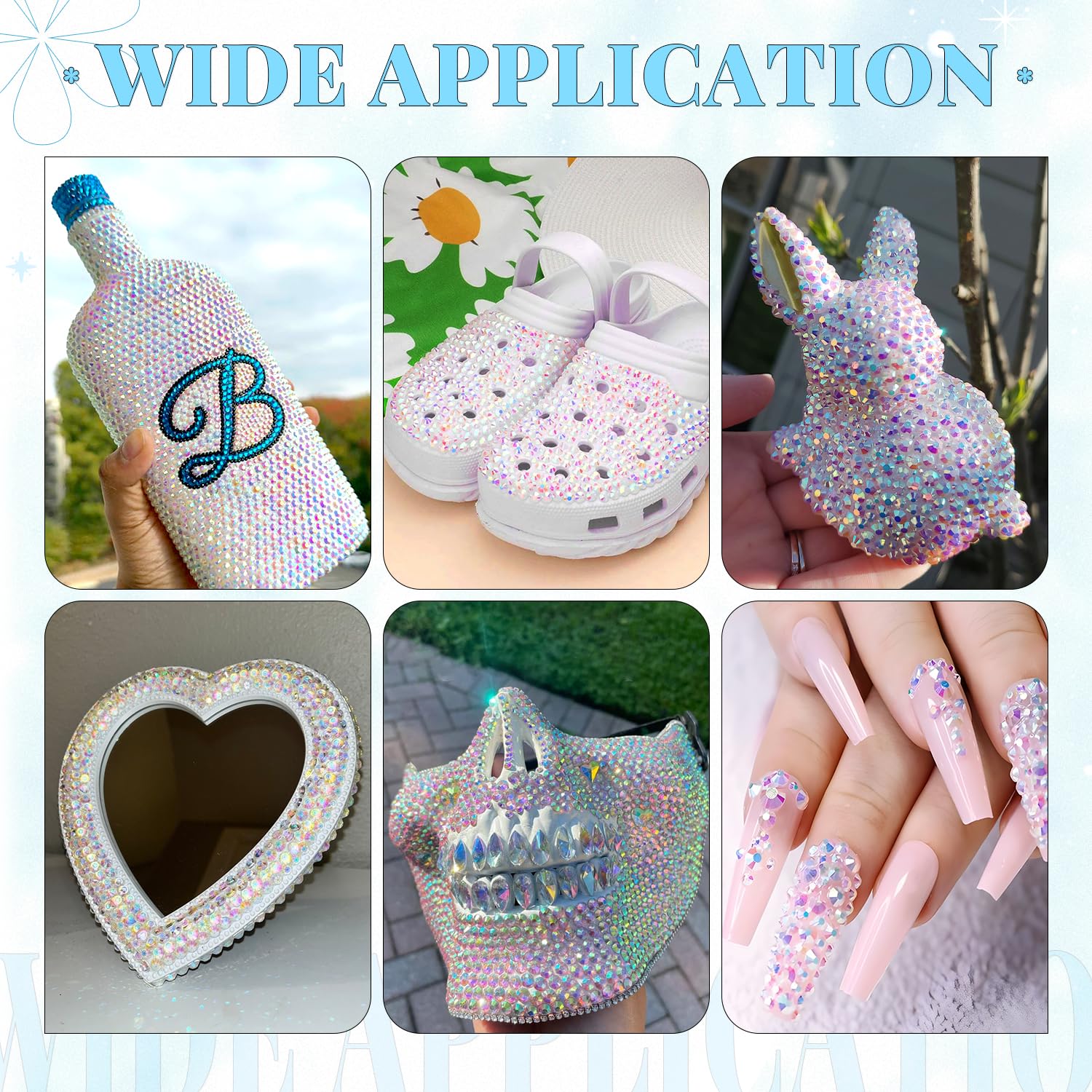 - WIDE APPLICATION -- These sparkling iridescent resin rhinestones are perfect for creating dazzling looks. Use them for bedazzling crafts like shoes, tumblers, mugs, bottles, phonecases, bags, glasses, hats, masks, clothing, clothes or nail art and more