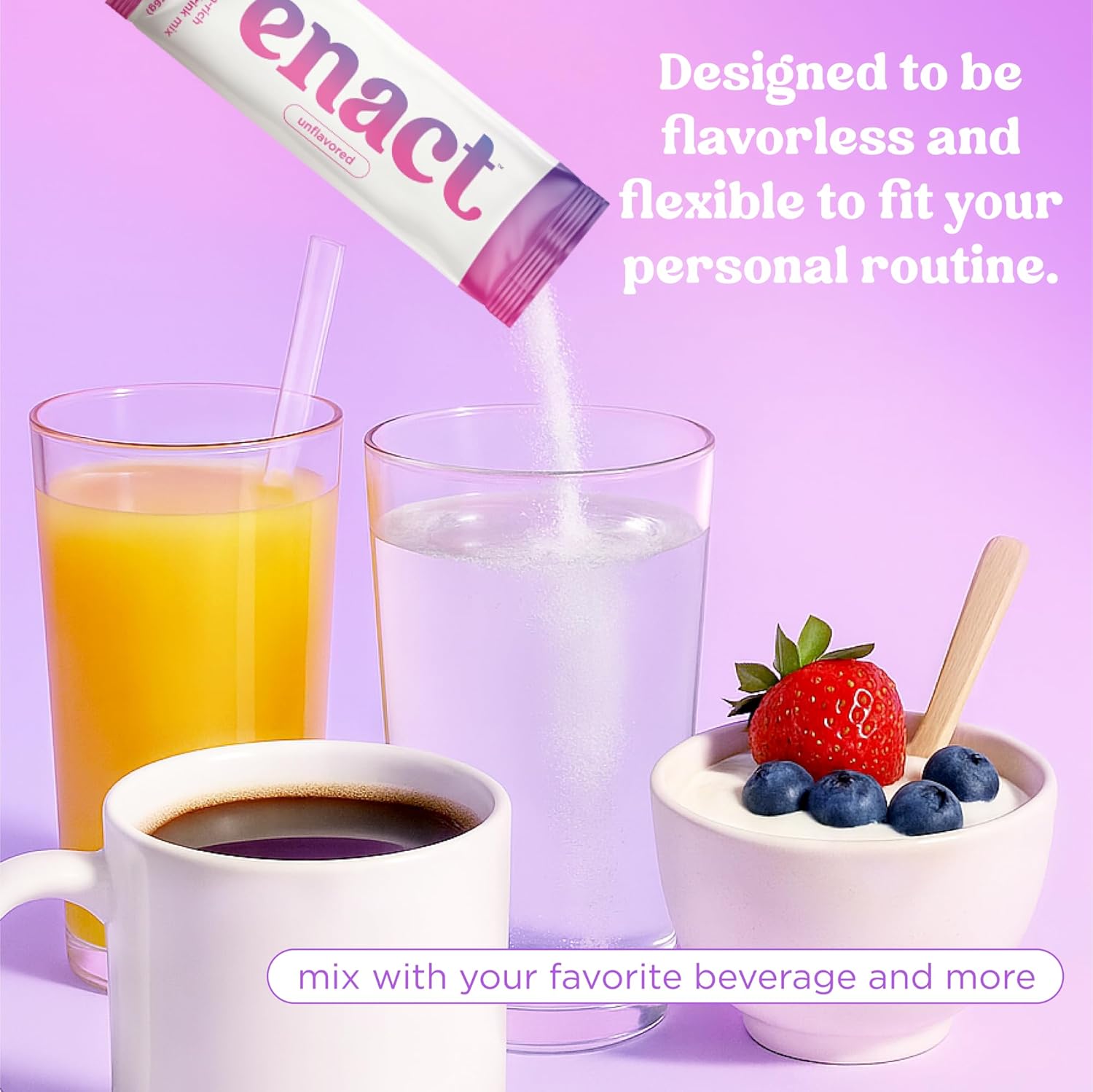 - FLAVORLESS AND FLEXIBLE: Enact is intentionally unflavored to mix easily into coffee, smoothies, or your favorite drink. Dissolves completely in water or any other daily beverage, creating an almost flavorless addition that's easy to consume daily. Basic Preparation: Add one packet to 16-32 oz. of water. Mix thoroughly until dissolved. Start with less water (16 oz.) if you prefer a stronger flavor, or more water (32 oz.) to dilute the saltiness.
