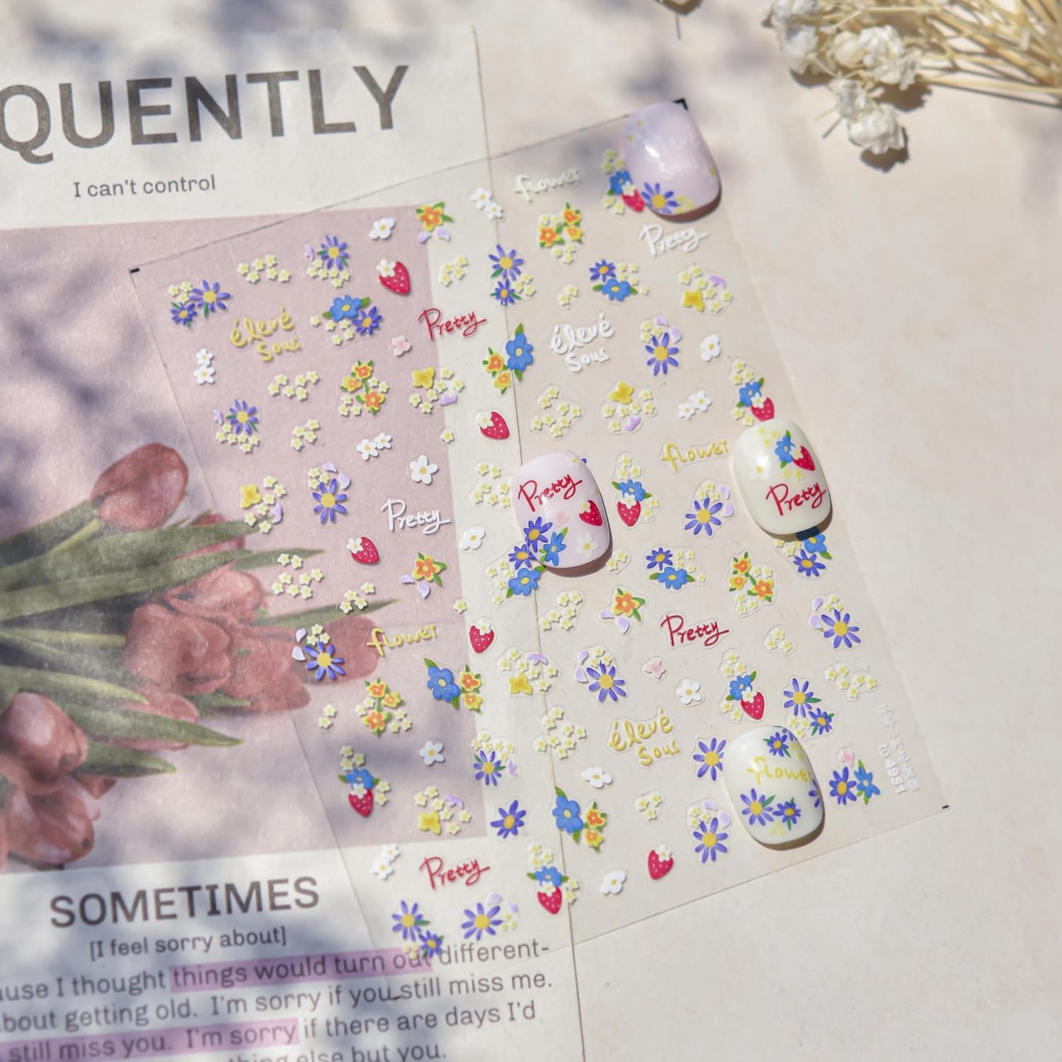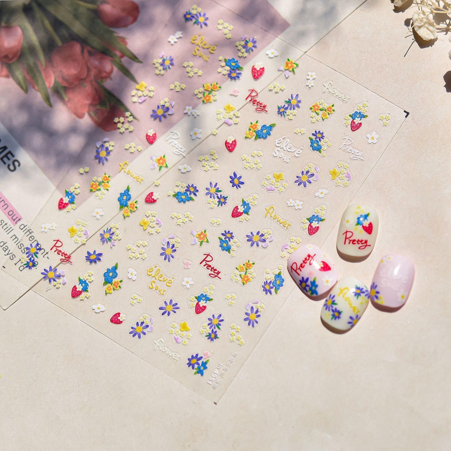 Flower Nail Stickers for Nail Art Strawberry Nail Stickers Summer Cute Floral Pink 5D Embossed Concise Nail Decals Self-Adhesive Nails Supply Manicure Sliders Flower for Women Nails Decoration