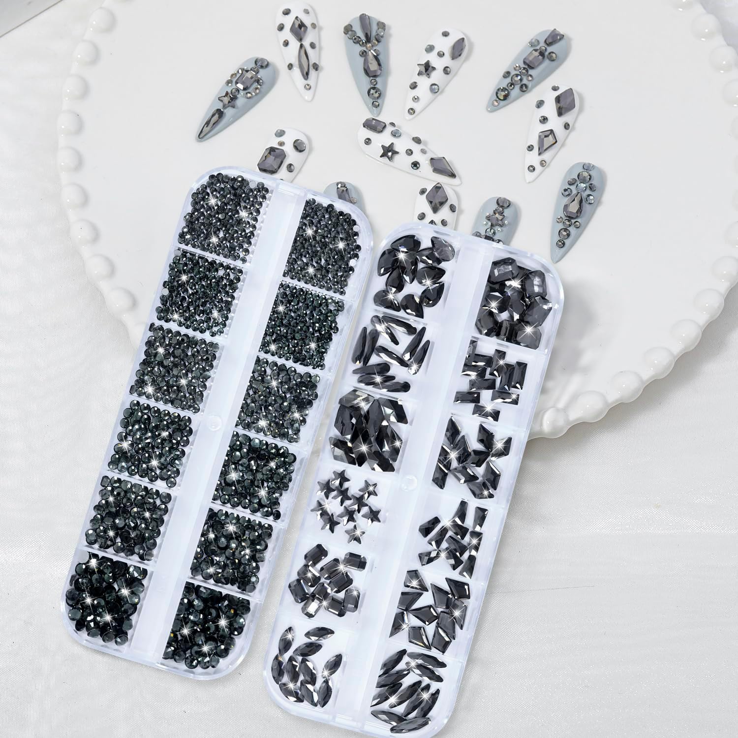 Nail Rhinestones - 3D Multi Shape Size, Flat Back, Crystals Manicure Rhinestones Charms, Transparent Gray Nail Gems, with Kit, for Nail Art, Bedazzling Acrylic Nails, DIY Decor