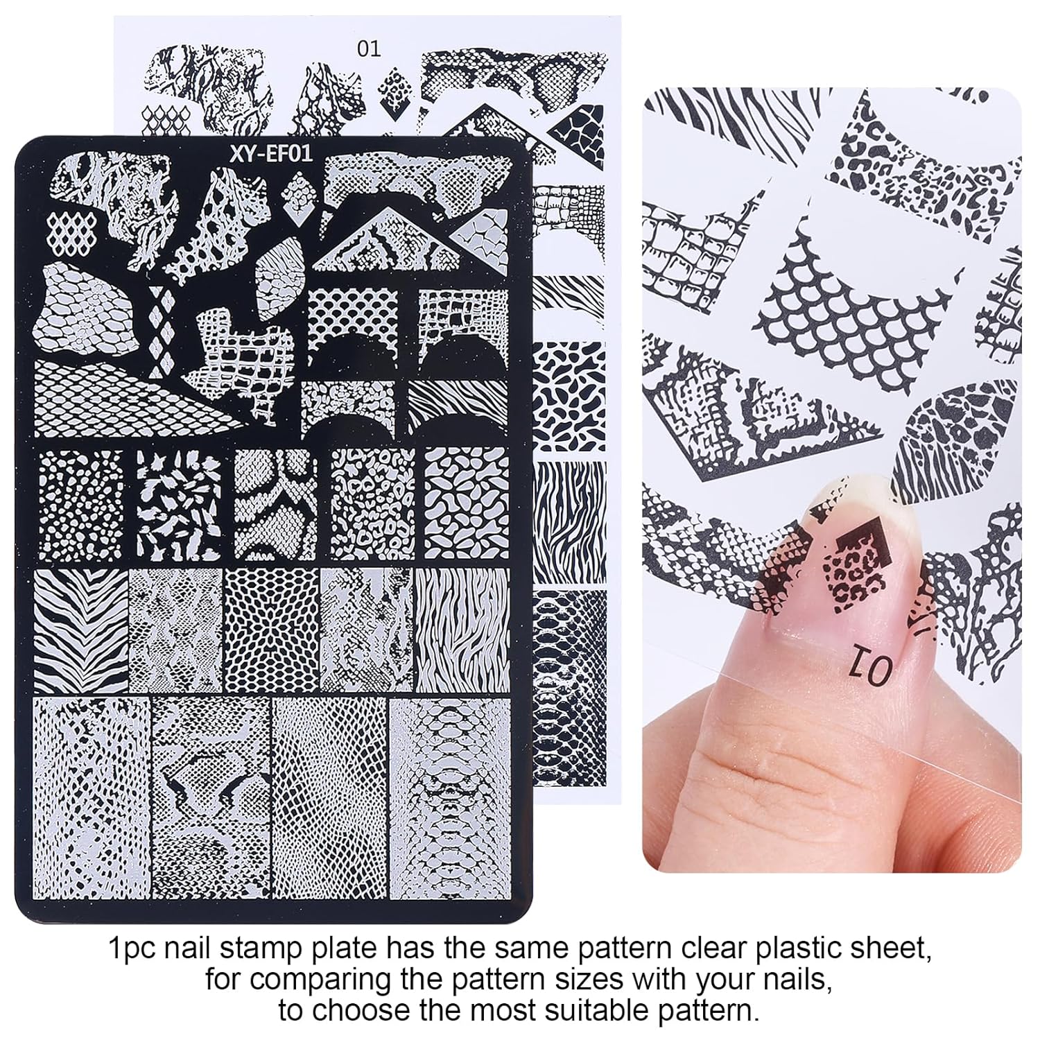 - - Includes a Pattern Reference Card for Easy Selection: One of the stamping stencil comes with a plastic reference sheet matching the pattern, allowing you to easily preview and select the design and the pattern sizes that best suits your nails before use. You can intuitively see the approximate effect of the pattern transfer on the nail.
