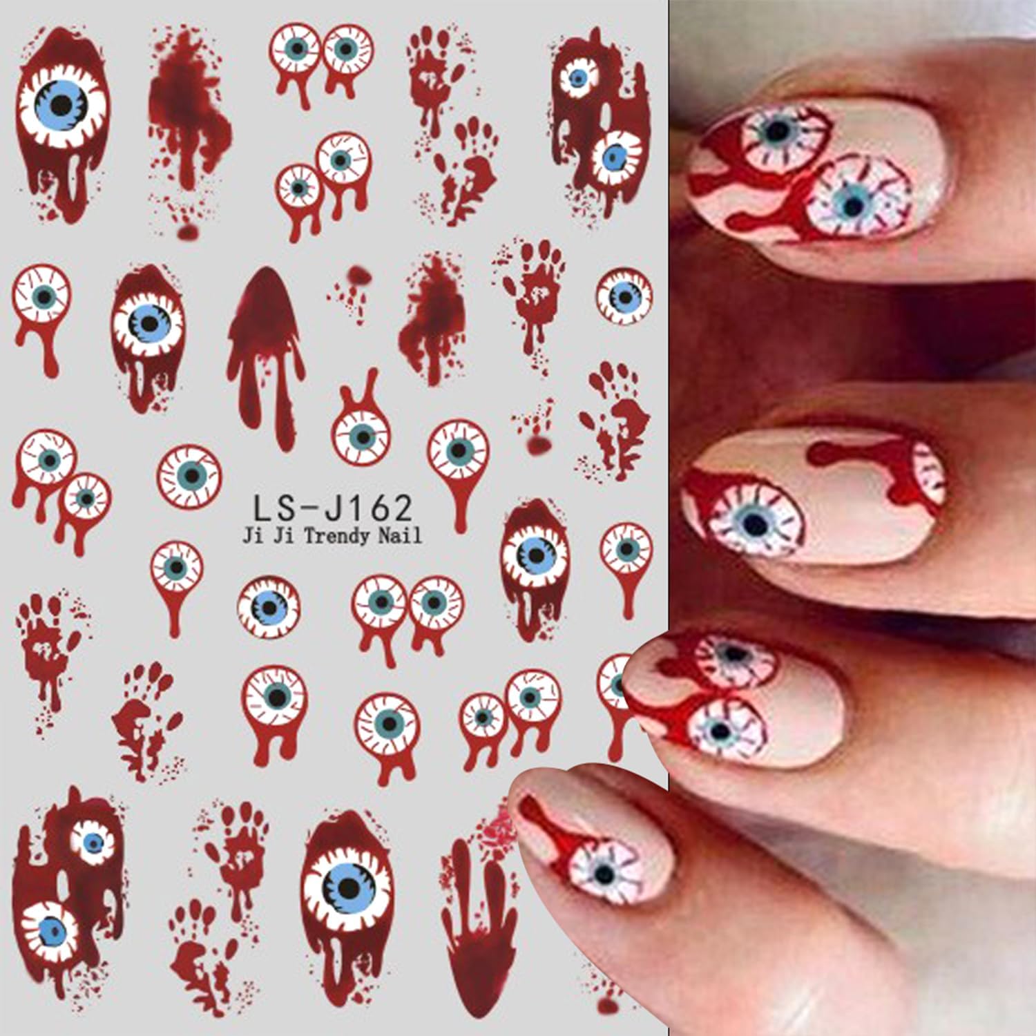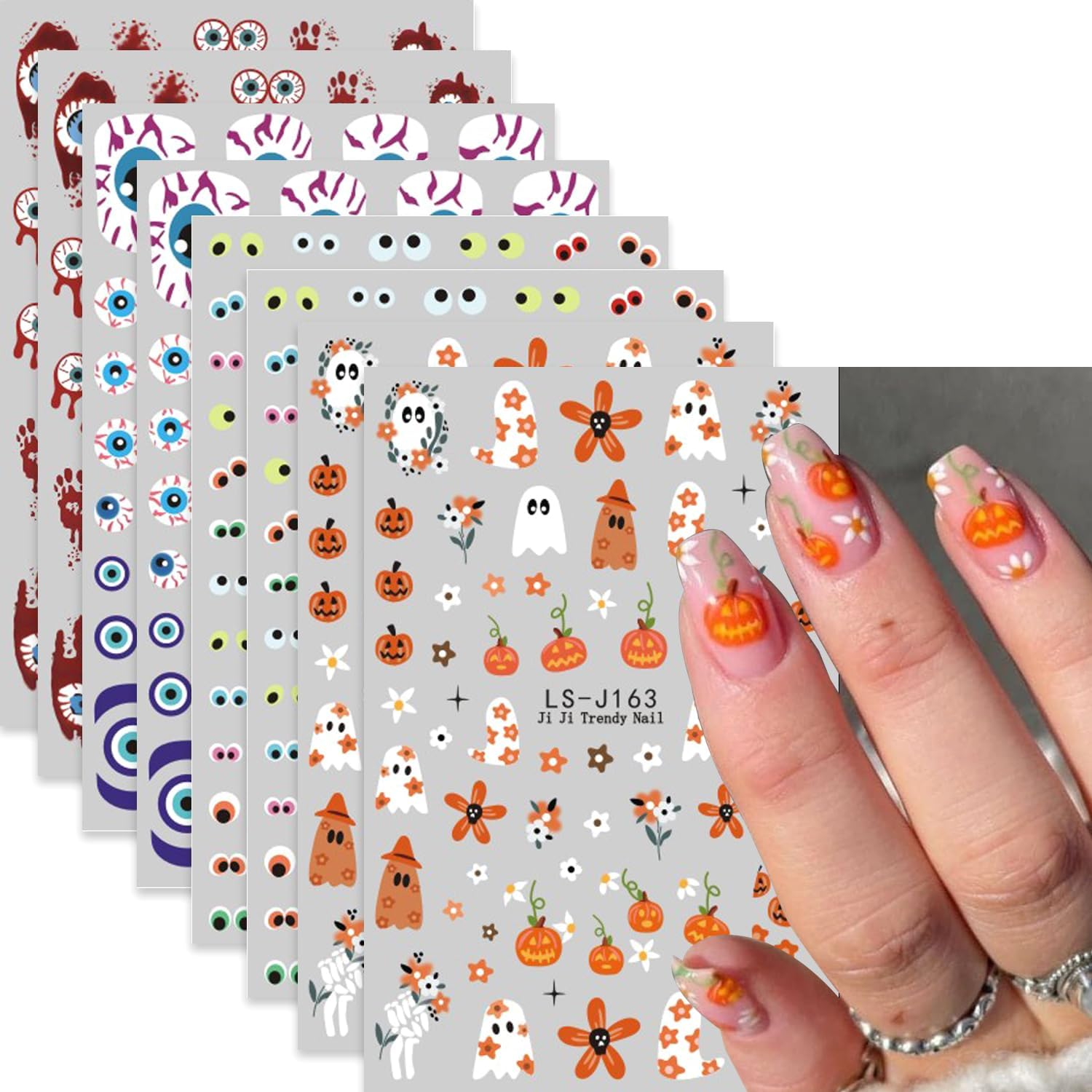 - Quantity: You will get 8 sheets of Halloween nail art stickers, including eye blood drop and pumpkin pattern designs, not easy to fall off or fade, can easily create a variety of themed nail art