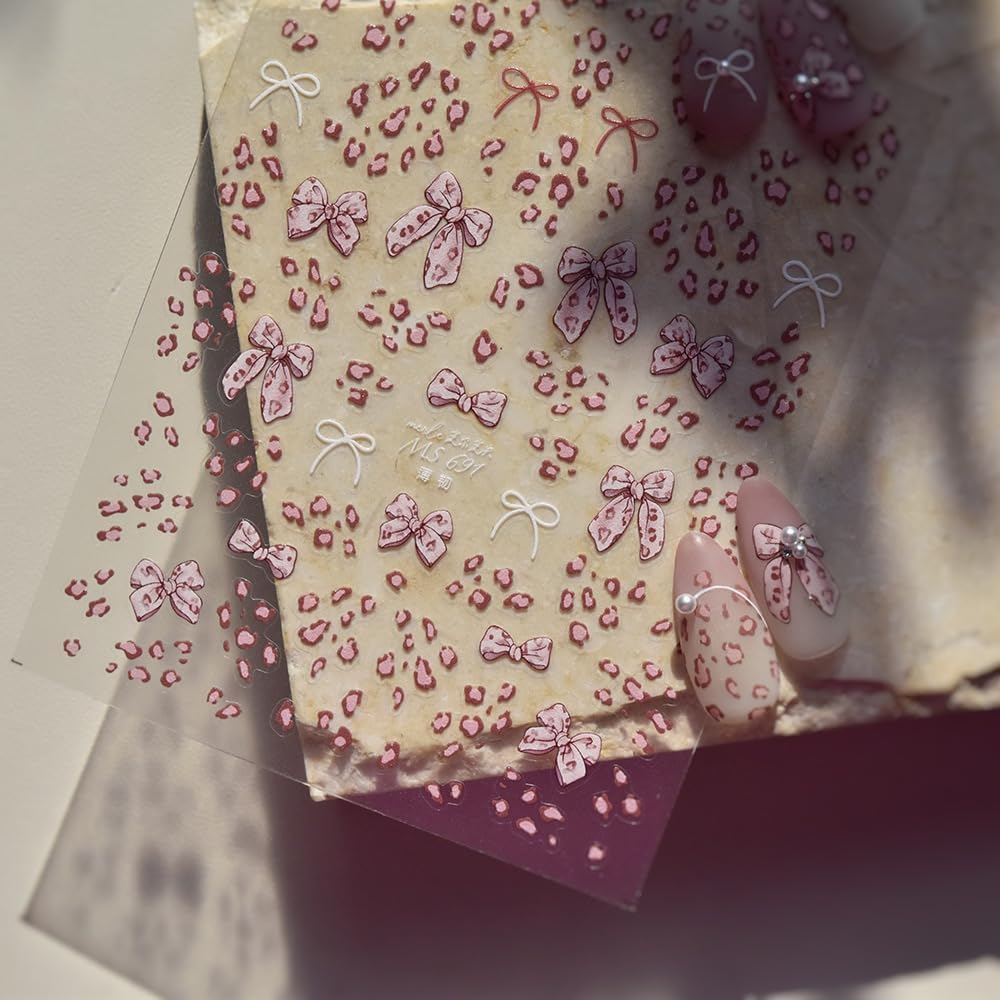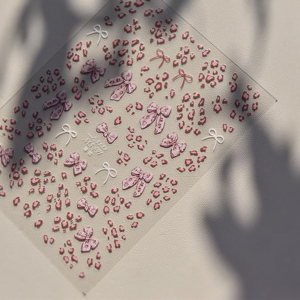 Pink Leopard Bow Nail Art Stickers 3D Embossed Fall Winter Nail Stickers, Self-Adhesive Durable Nail Art Decals for Women Girls, Nail Wraps Decoration Manicure for DIY Acrylic Nail Accessories